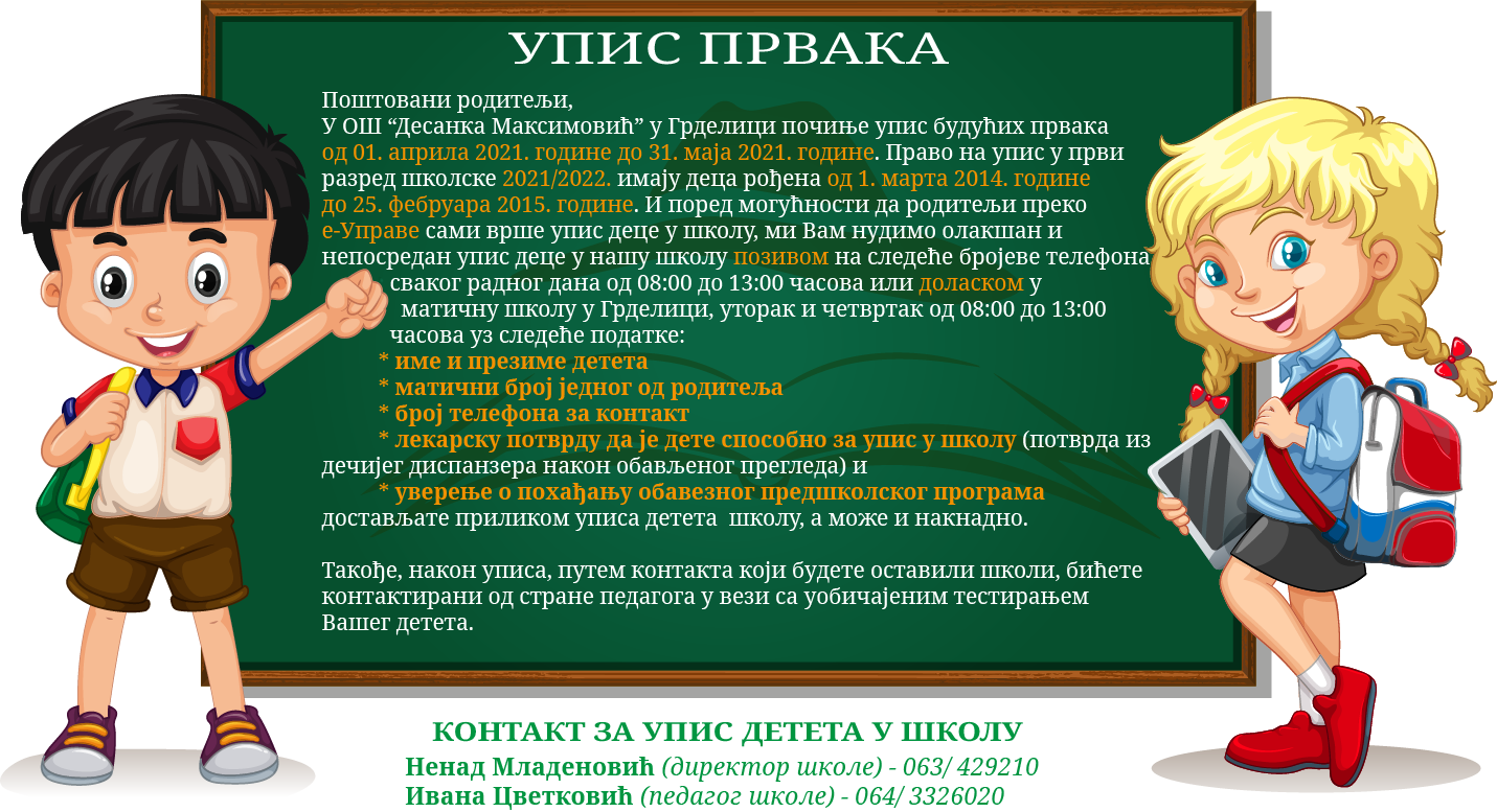 И ове године родитељи / други законски заступници који су грађани Републике Србије могу електронским путем да закажу на Порталу еУправа (https://euprava.gov.rs/) термин за упис и тестирање детета у основну школу покретањем услуге еЗаказивање термина за упис и тестирање детета у ОШ.